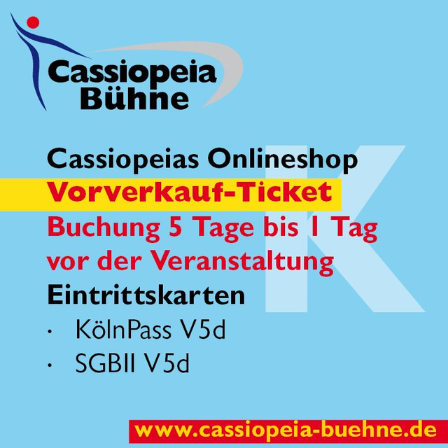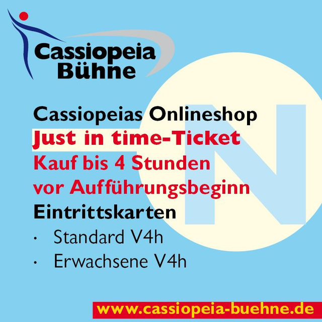 Eintrittskarte: – Wird an der Tageskasse der Cassiopeia Bühne am Veranstaltungstag hinterlegt.